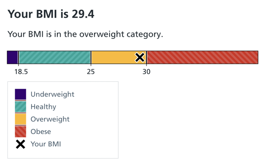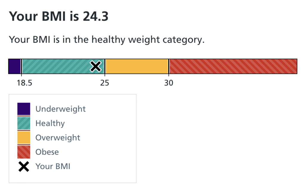 The shame of not looking good enough has followed me for decades. I was fat-shamed as a child. That abuse and bullying carries on to this day. At some point, in my early thirties, I visited my family and nearly everyone commented on my size. I don’t have many full-body photos from that time; most were cropped above the neck. You’ll have to take my word that a 1.72m (5ft6), 70kg (11 stone) adult is not fat. The NHS classifies a BMI of 24 as within the normal range (screenshot below, left) although I can’t imagine why it’s so close to the limit of being overweight. More on the topic of BM’s another time.
