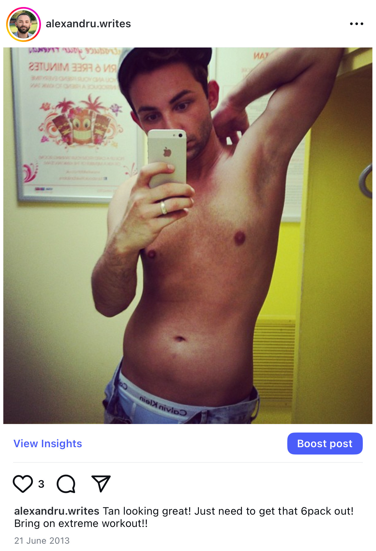 I took this picture at a tanning salon. I was 23. I had to dig deep in my archival photos to find it. I was 23. I remember sucking in my belly and raising my arm so that my tiny biceps would show. I framed myself in the mirror by the sun bed and thought “that may work”. I knew it wasn’t good enough. It never was. I then posted that picture on instagram. Not much in the way of a response; perhaps not much of a thirst trap. When I got home, I tortured myself with the Insanity workout (if you never heard of it, it’s basically HIIT). I was hungry for acceptance, for care.
